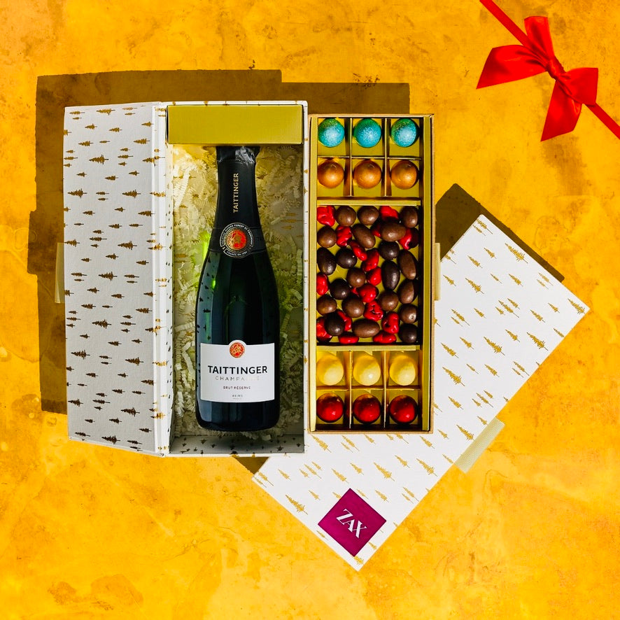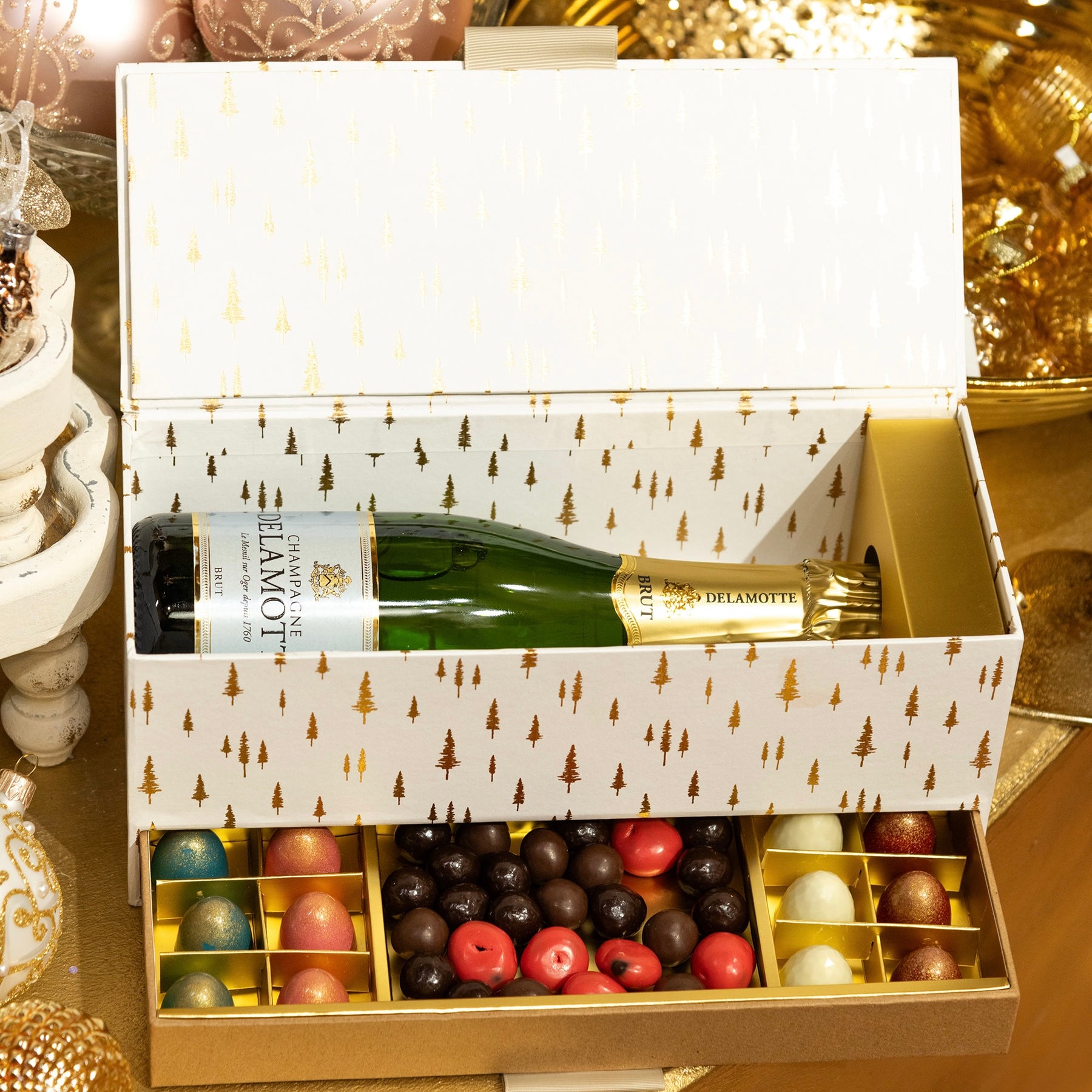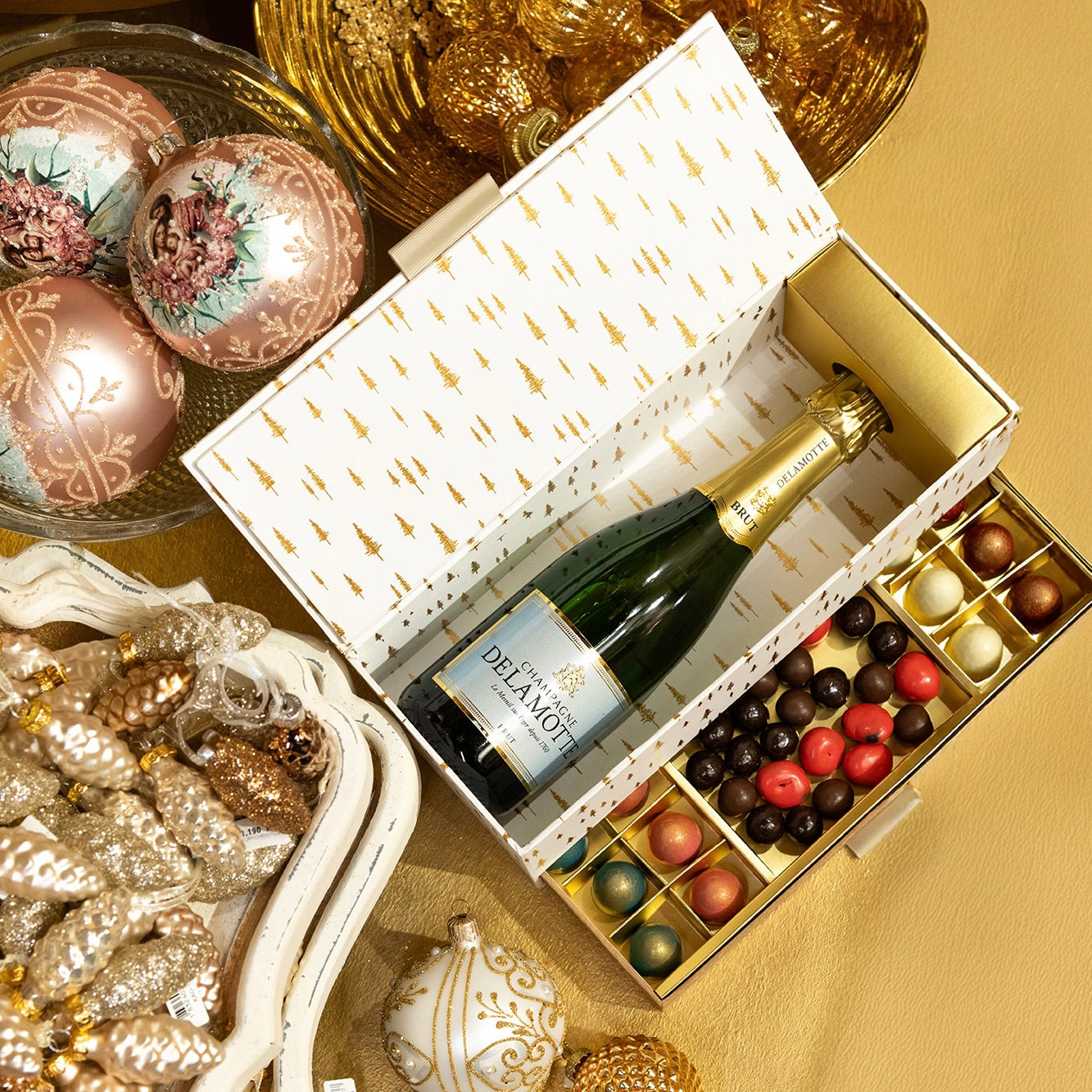 Új ünnepi kollekciónk egy luxus dobozban tartalmazza a Delamotte Brut 0,375 l pezsgőt, tizenkét pralinét négy különböző karácsonyi ízben, valamint finom drazsékat ét és tejcsokoládéból. Éld át a karácsony luxusát ezzel az exkluzív ajándékkal, amely a legigényesebb szíveket is kielégíti!